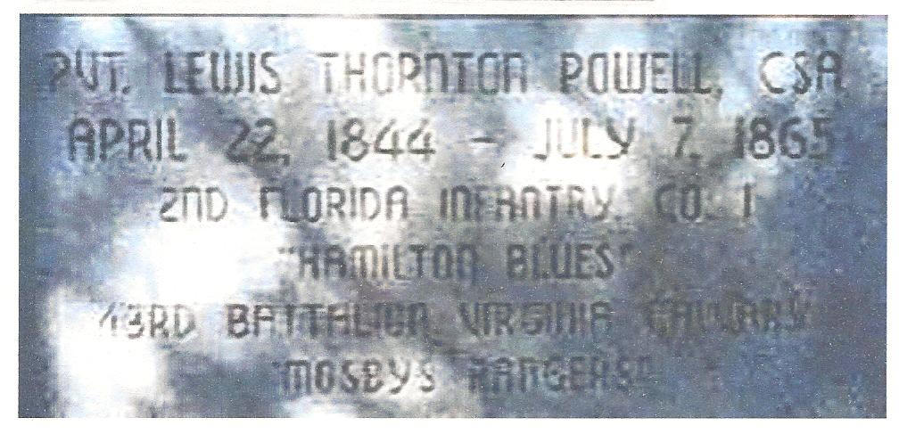 Following the battle of Frazier's Farm came the Maryland campaign. On December 13[1862] the battle of Fredericksburg was fought. The Regiment lost: killed, 1 non-commissioned officer and 3 privates; wounded, 4 officers, 5 non-commissioned officers and 25 privates (casualties in Co. K not reported). A partial report of the casualties at Chancellorsville [May 1863] show 3 officers and 17 privates wounded, and 3 privates killed. In the battle of Gettysburg [July 1863]: Killed, 6 officers, 4 non-commissioned officers and 5 privates; wounded, 6 officers, 6 non-commissioned officers and 54 privates; total casualties, 81. There is no report accessible of the casualties during the year 1864 and 1865, and it was during these years that some of the most desperate and bloody battles were fought; and in all of them the 2nd Florida did its full measure of duty. It was but a skeleton of a splendid regiment that surrendered at Appomatox Court House -- but 7 officers and 59 men."