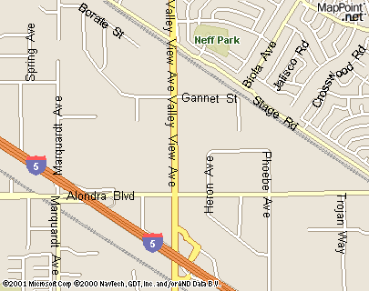 Get to the Santa Ana Freeway (Interstate 5) and go North or South towards La Mirada Exit on Valley View Avenue. Then go North to Stage Road and turn right.